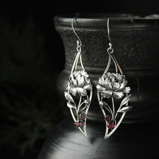 Boucles d'Oreilles Boho Élégantes avec Floral en Argent et Zircon Rouge Étincelant